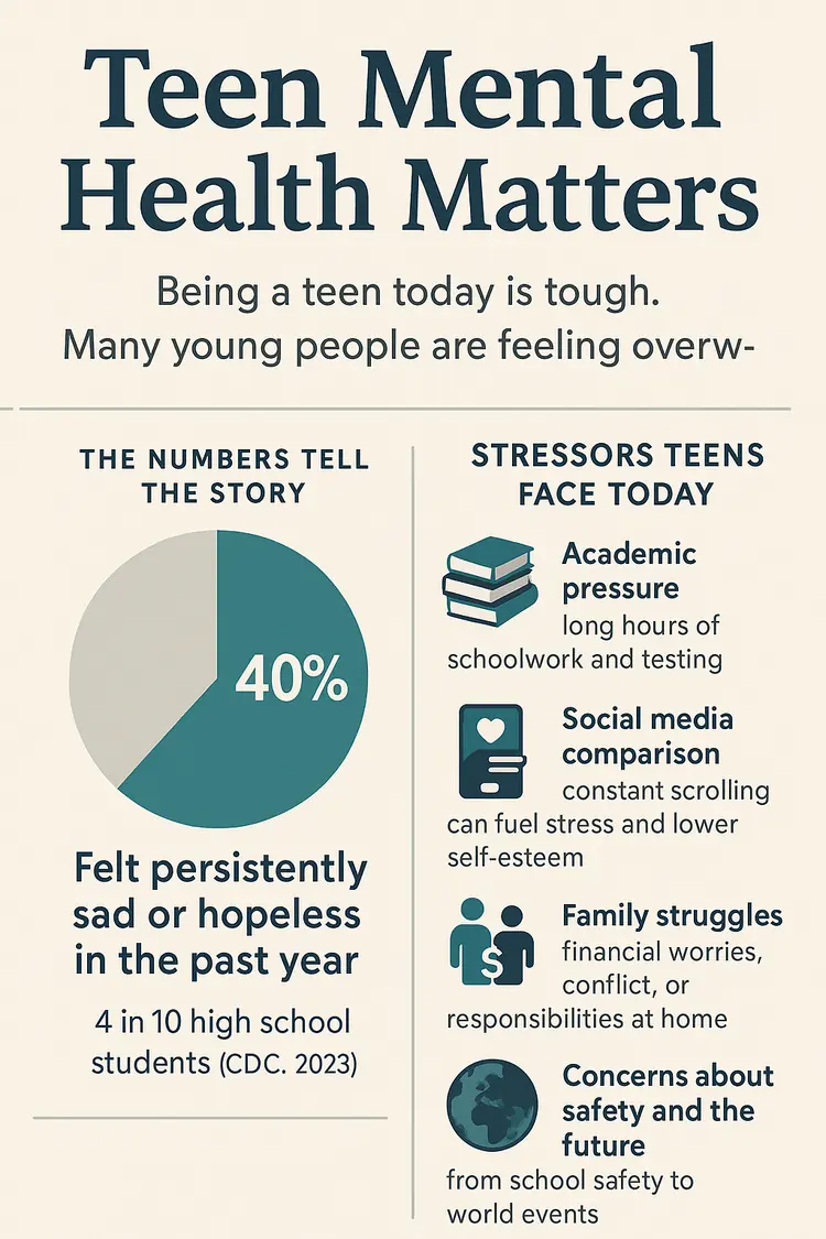 Being a teen today is tough. Between pressure at school, the constant buzz of social media, family responsibilities, and a world that feels uncertain, many young people are feeling overwhelmed. That’s why mental health matters now more than ever—for teens and for the adults who support them.
